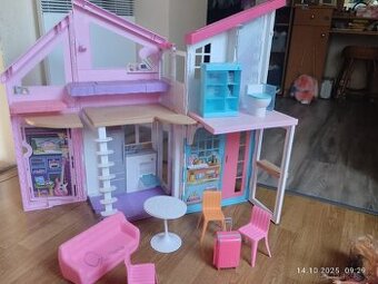 Domeček pro Barbie a jiné panenky včetně vybavení. Hraný, ale pořád pěkný stav, pár drobných nedostatků - fleky od vody na podlaze, zašpinené křeslo, povlečení na posteli nejde sundat. Světélka na terase fungují, sporák svítí a vydává zvuky. V113 cm, ...