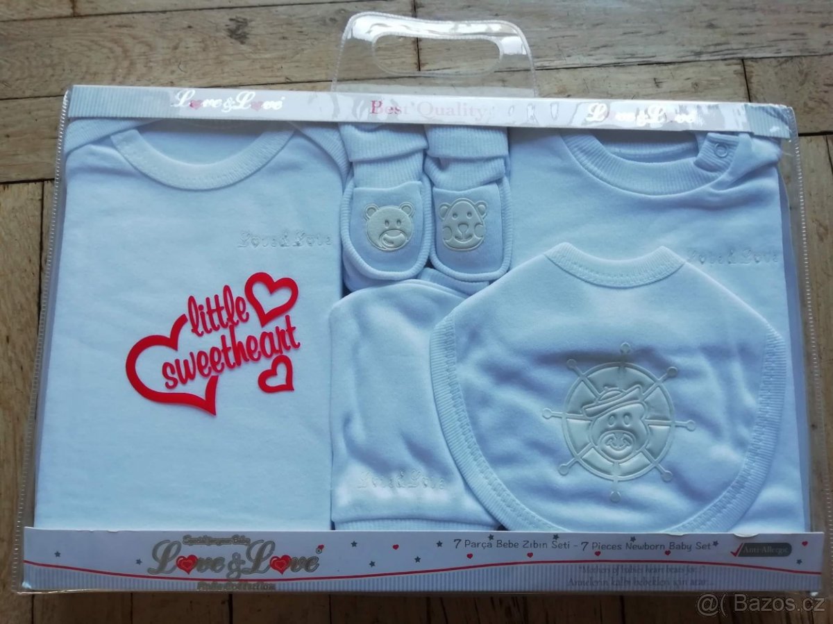 Sedmidilna bavlněná soupravička do porodnice. V barvách modrá, růžová, žlutá, bílá a krémová. Set obsahuje bodycko, dupačky, kabátek, čepičku, rukavičky, botičky a bryndacek. Vhodné jako dárek.