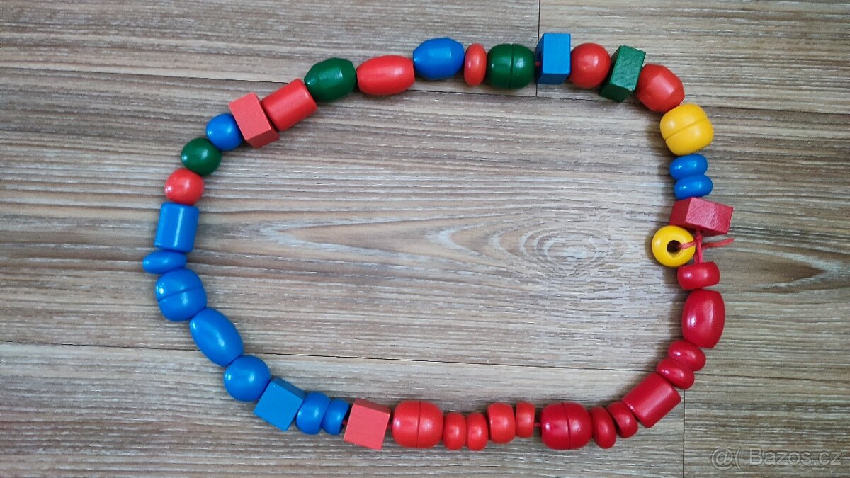 Dřevěné korálky na navlékání pro nejmenší děti - [19.12. 2025]Dřevěné korálky na navlékání pro nejmenší děti, dvě sady, obsahují klasické korálky nebo kytičky, lístečky, motýlka, zelená dlouhá šňůrka a čtyři červeno-bílé.