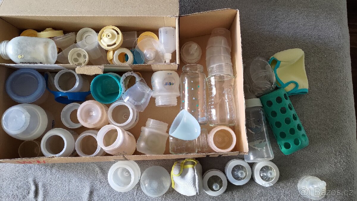 Kojenecké dětské lahvičky, různé druhy (sklo i plast) a značky - Philips Avent, Medela, atd., obaly na lahvicky - silikon, neopren, chrániče bradavek, kapilára pro pomoc s kojením, krabičky pro uložení jidla apod., viz foto. Preferuji osobní převzetí (sklo bych nerad zasílal) a odběr všeho najednou. Cenu nabídněte.