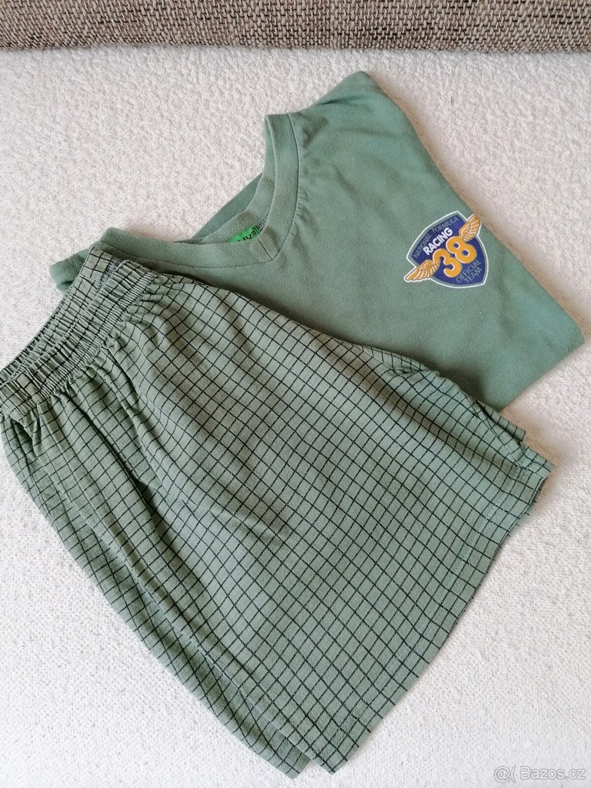 Pyžamo Molvy, velikost psaná 140, ale je menší, délka trenek 32/11 cm, pas v klidu 2 x 27,5 cm, triko délka 50 cm, šířka 39 cm. Osobně Praha 4 - Spořilov nebo Dobříš, jinak cena dle ceníku zvoleného dopravce.