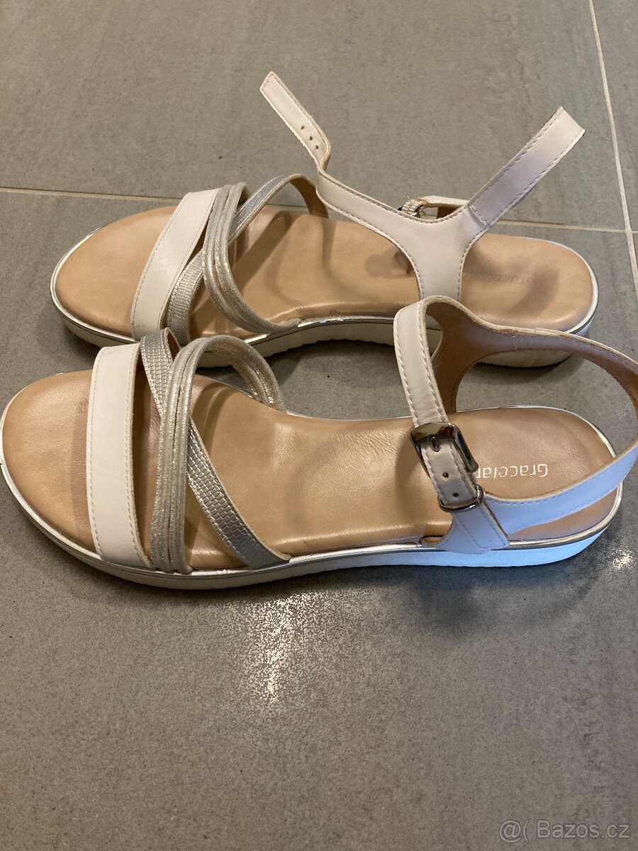 Prodám letní bílo stříbrné sandálky vel.39. Velmi zachovalé, málo nošené, měkká stélka.