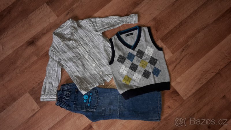 Set vel. 92 (rifle, vesta, košile). Pěkný stav. K vestičce jsme nosili košili na fotce nebo pruhovanou George, foto přikládám, na prodej samostatně v mé nabídce, cena je uvedena za komplet, poštovné dle tarifu ČP.