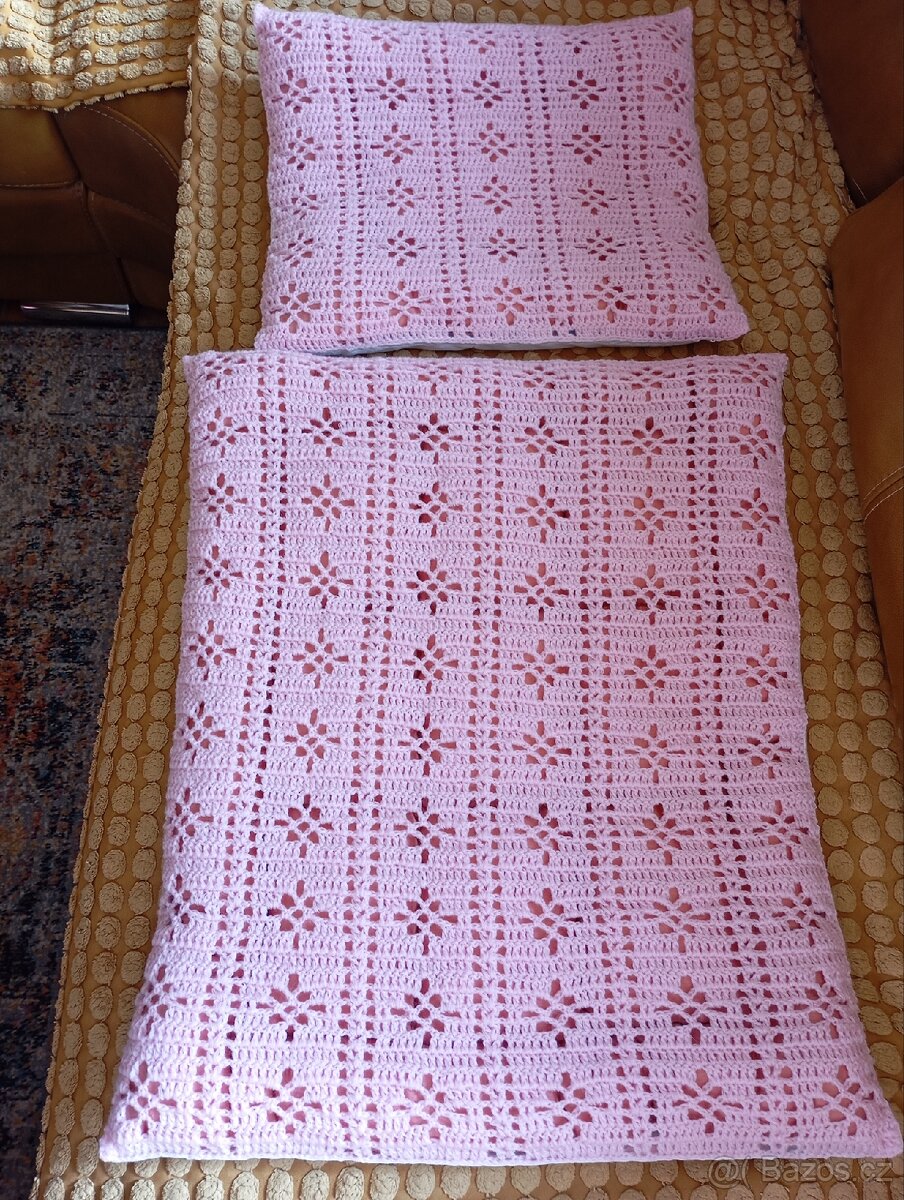 Háčkované, růžové povlečení na staré perinky.Material vlna.