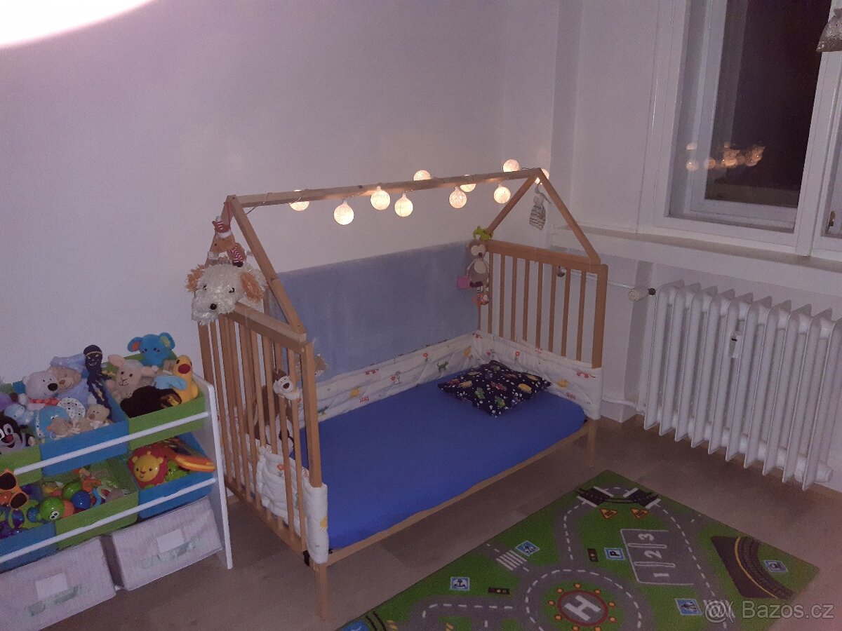 Domečková postýlka, včetně matrace, prostěradla, protičuracích podložek, peřinka a polštářek, povlečení. Rozměr 120x60. Skvělá na naučení samostatného spaní, nízká, zábrana není potřeba.