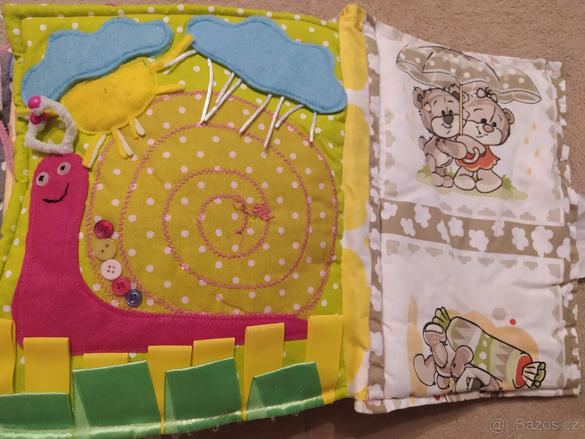 Používaná quiet book, trošku zdeformovaná myška a dírka u šnečka v ulitě, jinak ok. Jména jsou na suchý zip, takže jde použít pro kohokoliv.