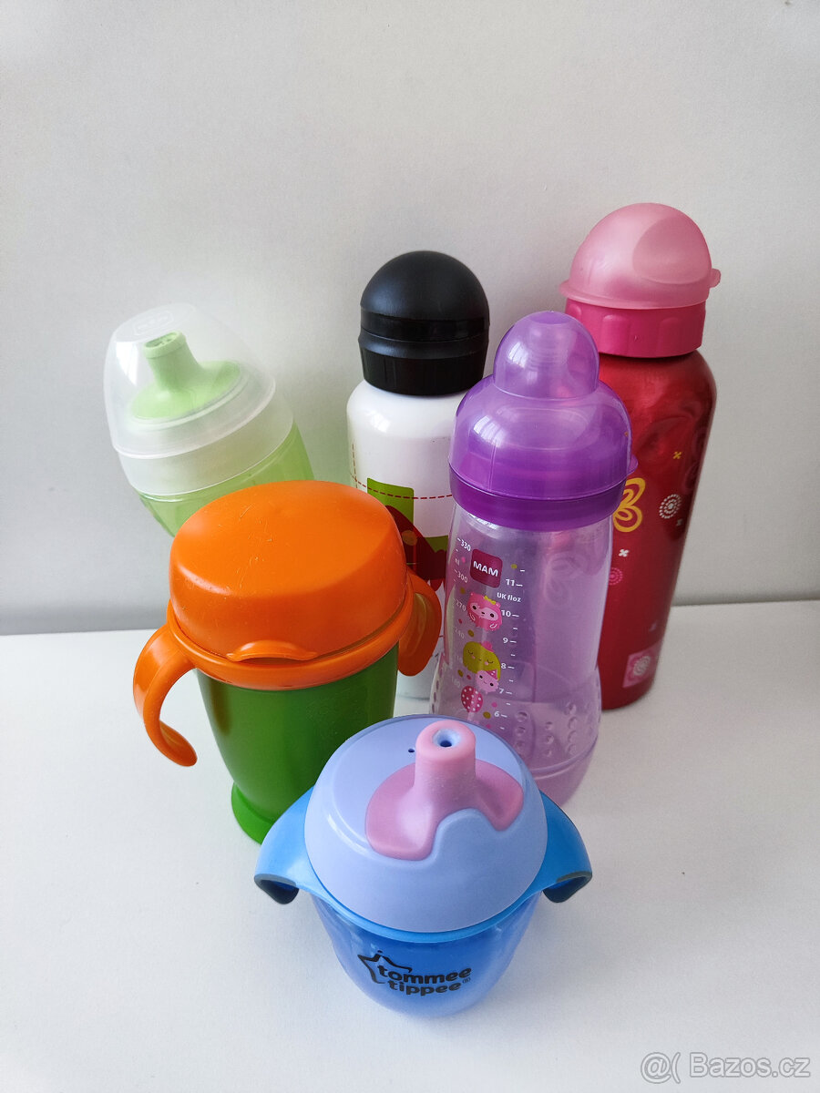 Používané, ale stále funkční lahvičky + netekoucí učící hrneček LOVI. Všechny díly k dispozici. Chybí jen ochranný kryt na modré pítko Tommee Tippee.