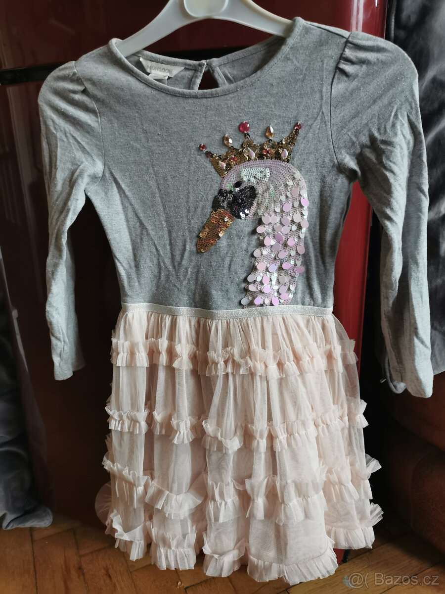 Šatičky značky Monsoon pro děti 5-6 let, šedo - sv. růžové barvy se třpytivou labutí s korálky, zadní délka 61 cm, přes hrudník 2 x 33 cm, v zachovalém stavu.