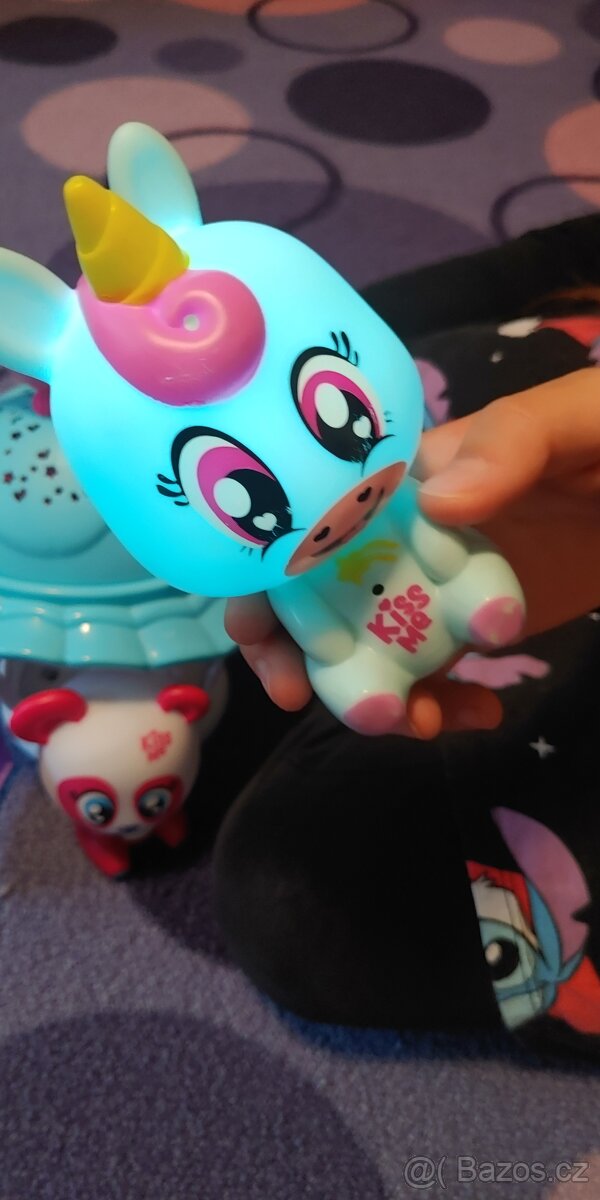 Lampicka svítí a zviratka taky svítí. Na stropě jsou hvezdicky a srdicka.