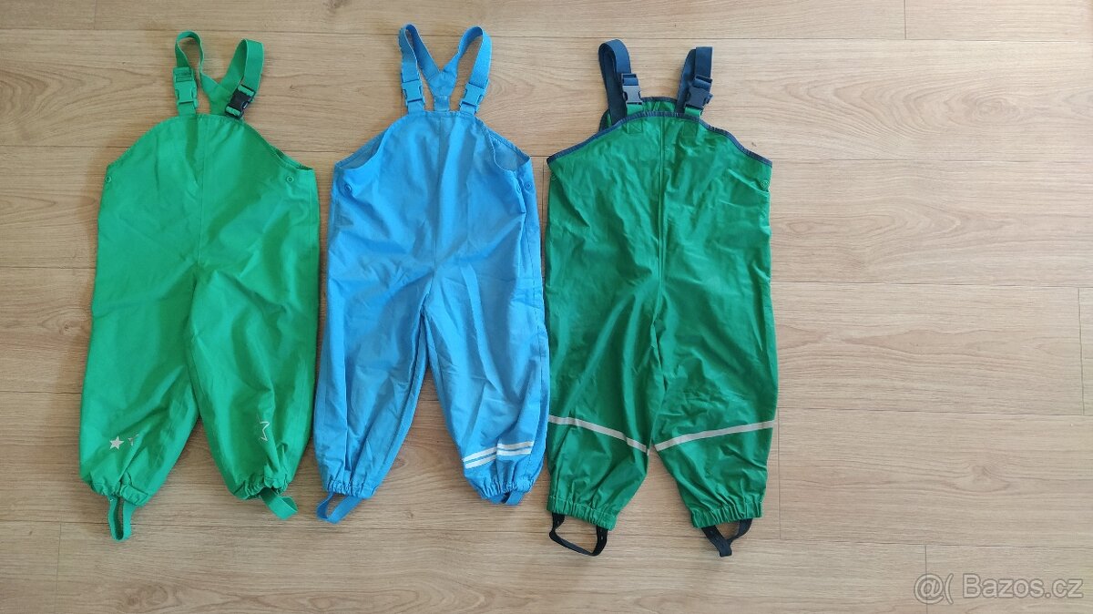 Kalhoty do deště nepodšité fleecem. První zelené a modré značka Tchibo. Tmavší zelené značka Playshoes. Světlejší zelené mají vyměněnou přezku.