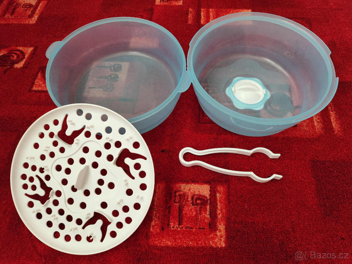 Rychle a snadno sterilizuje láhve, odsávačky mateřského mléka a ostatní doplňky.