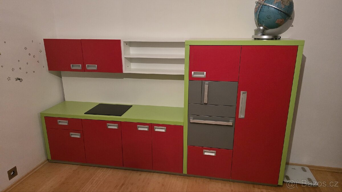 Dětská kuchyňka vyrobena na zakázku ( kvalitní kování Blum doživotní záruka ) tlumení na dvířkách i na šuplíkách, výška 129cm šířka 231cm hloubka 42cm.