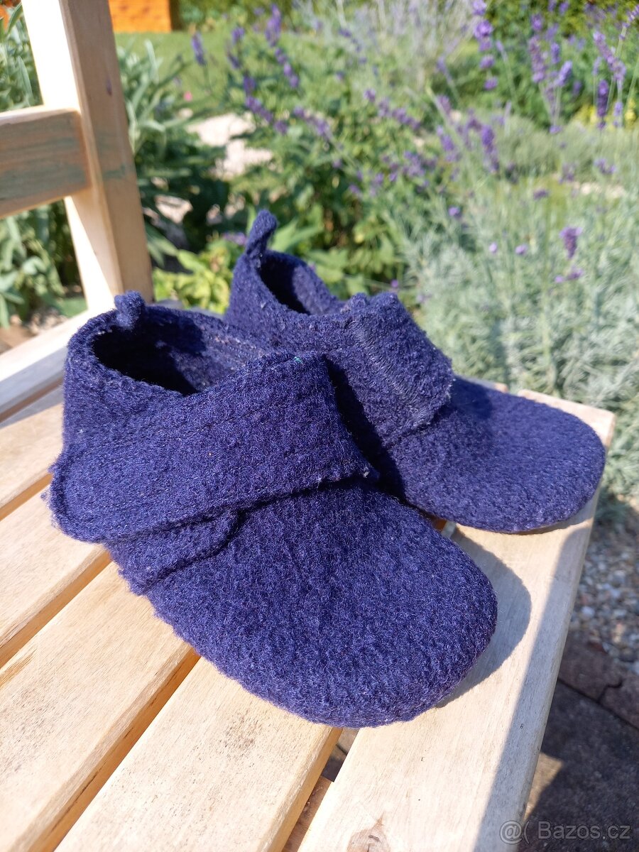 Teplé filcové přezůvky / bačkůrky /capáčky na doma nebo do školky. S velkým, suchým zipem přes nárt a poutkem na patě (dítě si díky nim obuje botky snadno samo). Celoplošná protiskluzová podrážka. Měkká, přizpůsobí se jakémukoli pohybu. Lehoučké. Příjemné a hřejivé.