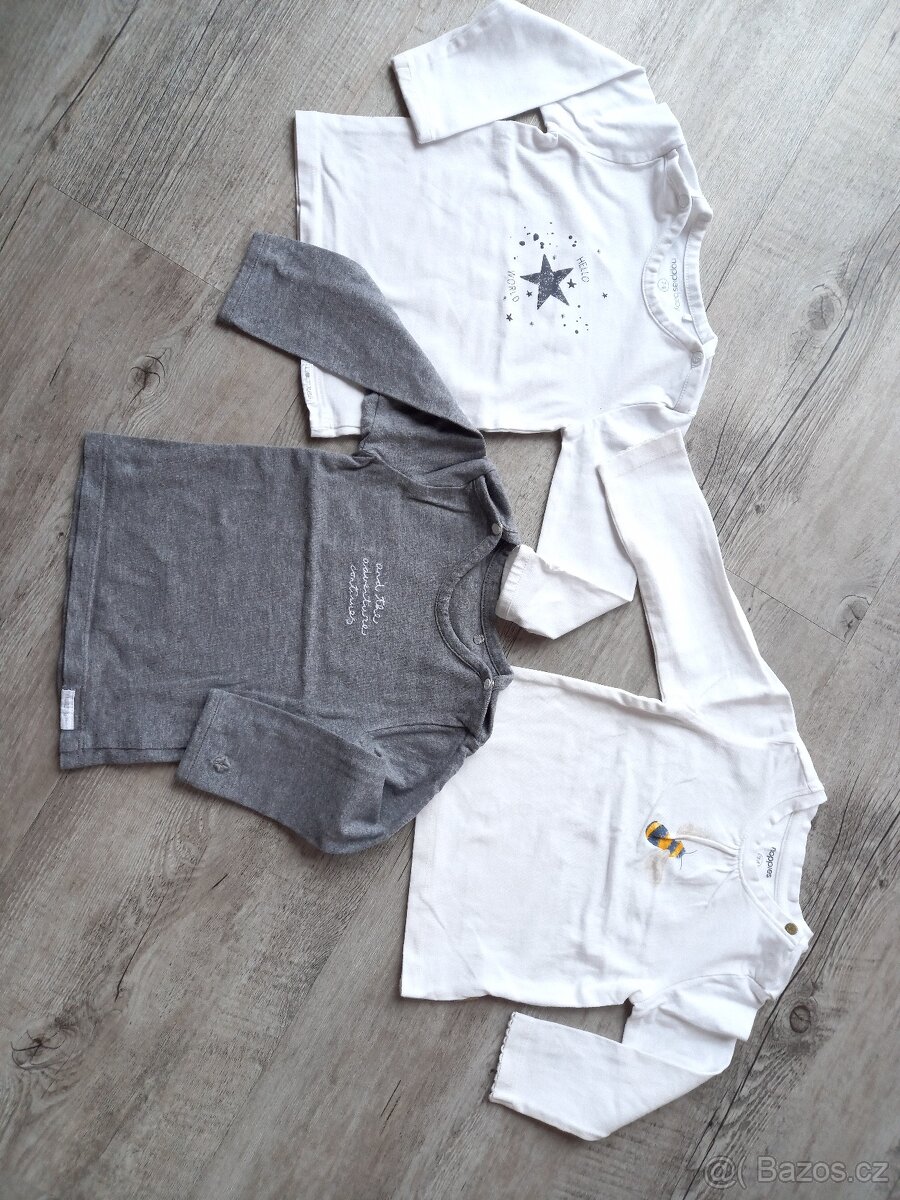 Sada tří triček s dlouhým rukávem skvělé značky Noppies. Vysoká kvalita. Zapínání na krásné patentky u krku (pohodlnné oblékání, žádné vytahané výstřihy). Veselé obrázky. Něžné detaily - výšivky, lemování atd.