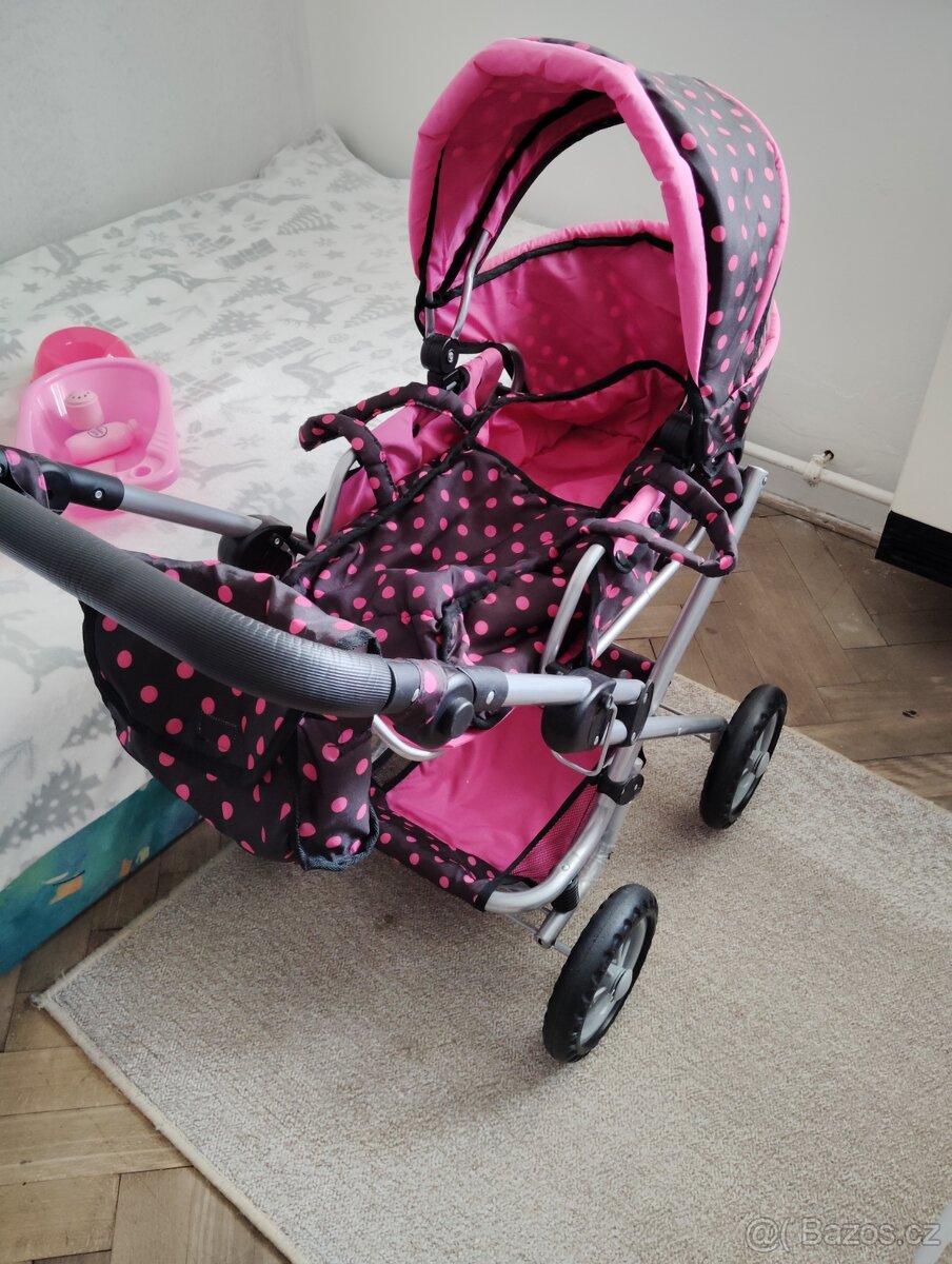 Prodám kočárek pro panenky černý s růžovými puntíky, vyjímatelná taška na přenášení panenky, taška pro příslušenství k zavěšení na rukojeť, rukojeť je výškově nastavitelná, bouda s průhledným okénkem, látkový košík pod kočárkem - cena 700,- Kč. Ke kočárku nabízíme Baby Born s příslušenstvím a zavinovačkou - cena 500,- Kč. Vše je v perfektním stavu jako nové. Při odběru kočárku i baby Born je cena za oboje 1000,- Kč.mozne předání Hradec Králové, Jaroměř, po dohodě Praha.