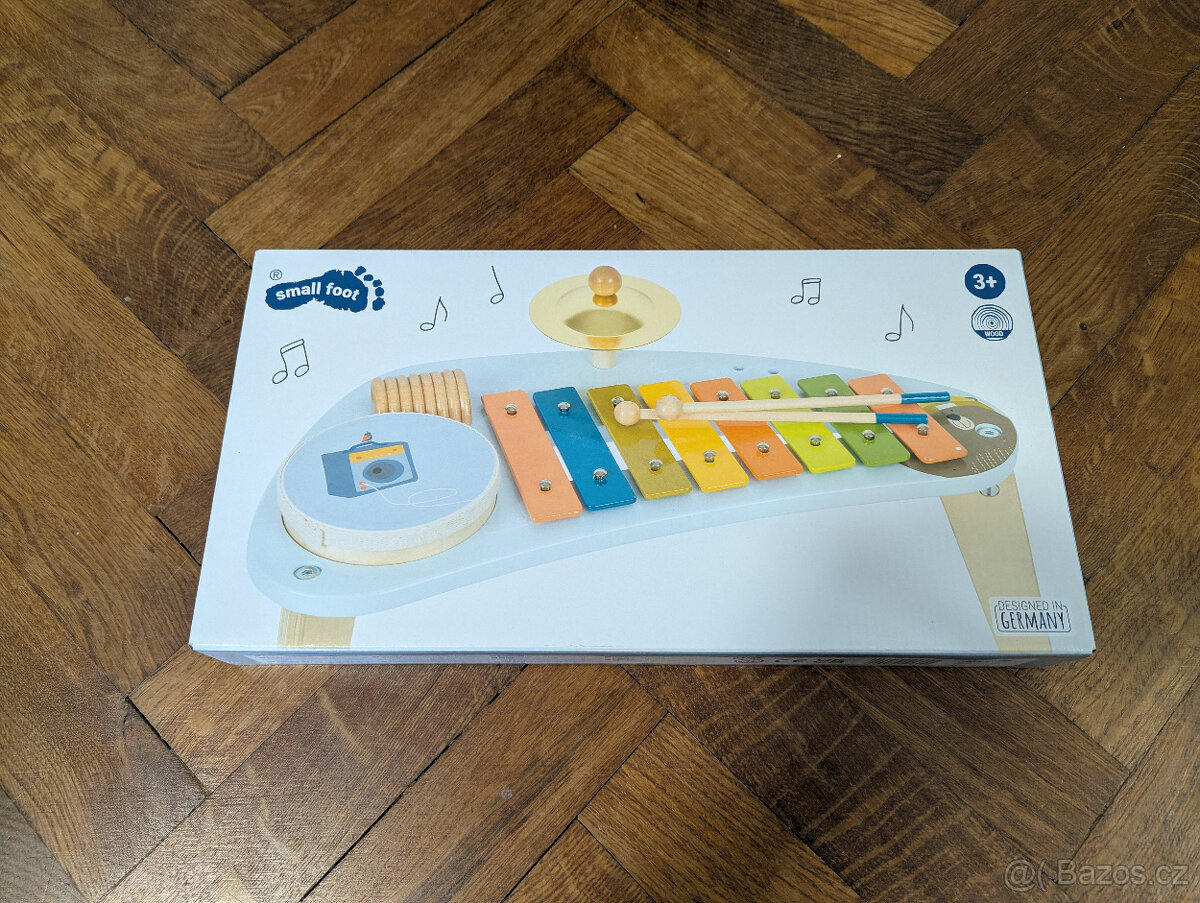 Vyrobeno z kvalitního dřeva, na třech nohách se skládá z xylofonu, bubínku, talířů a dvou tyčinek. Barevné proužky na xylofonu usnadňují hru s notami označenými stejným barevným schématem.