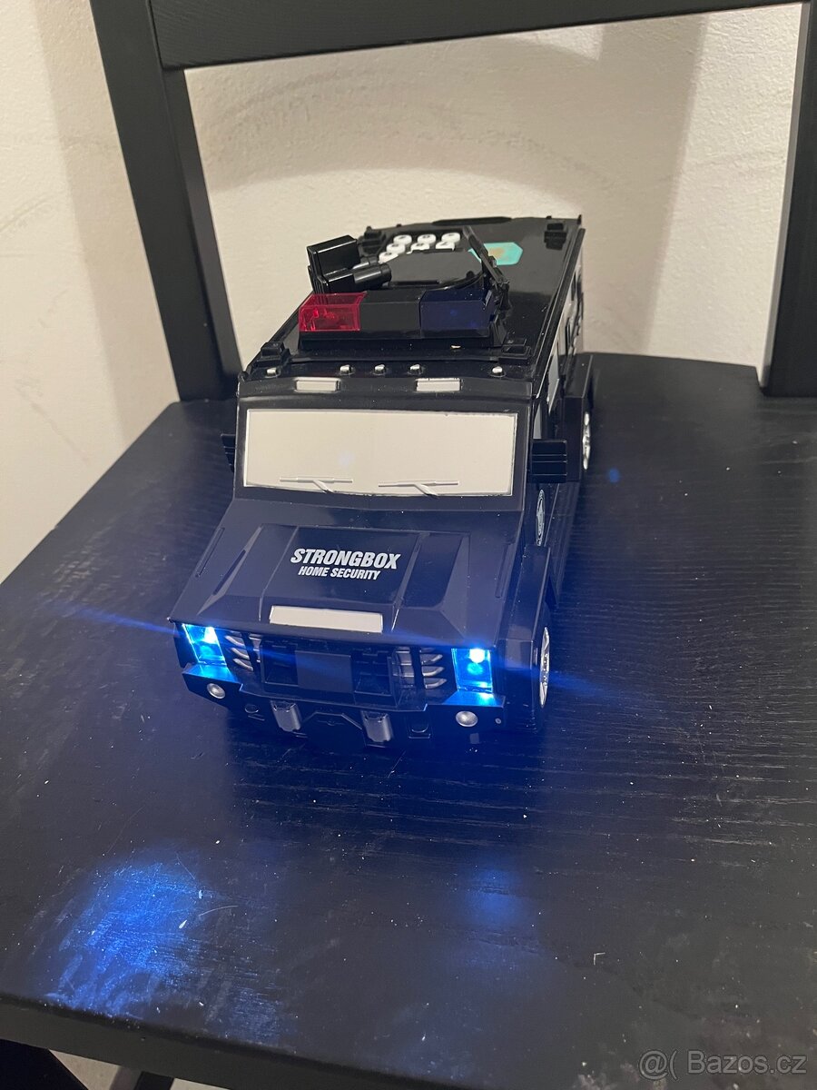 Prodám pokladnicku- policejni auto , lze vkladat mince i bankovky ty jsou automaticky pohlceny mechanismem. * se ovladaji zvuky .Na otisku prstu /cca 10 sec /je třeba držet prst nez se dvere otevrou.Kód je 0000, před tím se dá symbol # .Autu se daji rozsvitit světla, # dlouhym stiskem , přehravá melodie hudebnich nástrojů, zvuky zvířat, věty v angličtině apod.
