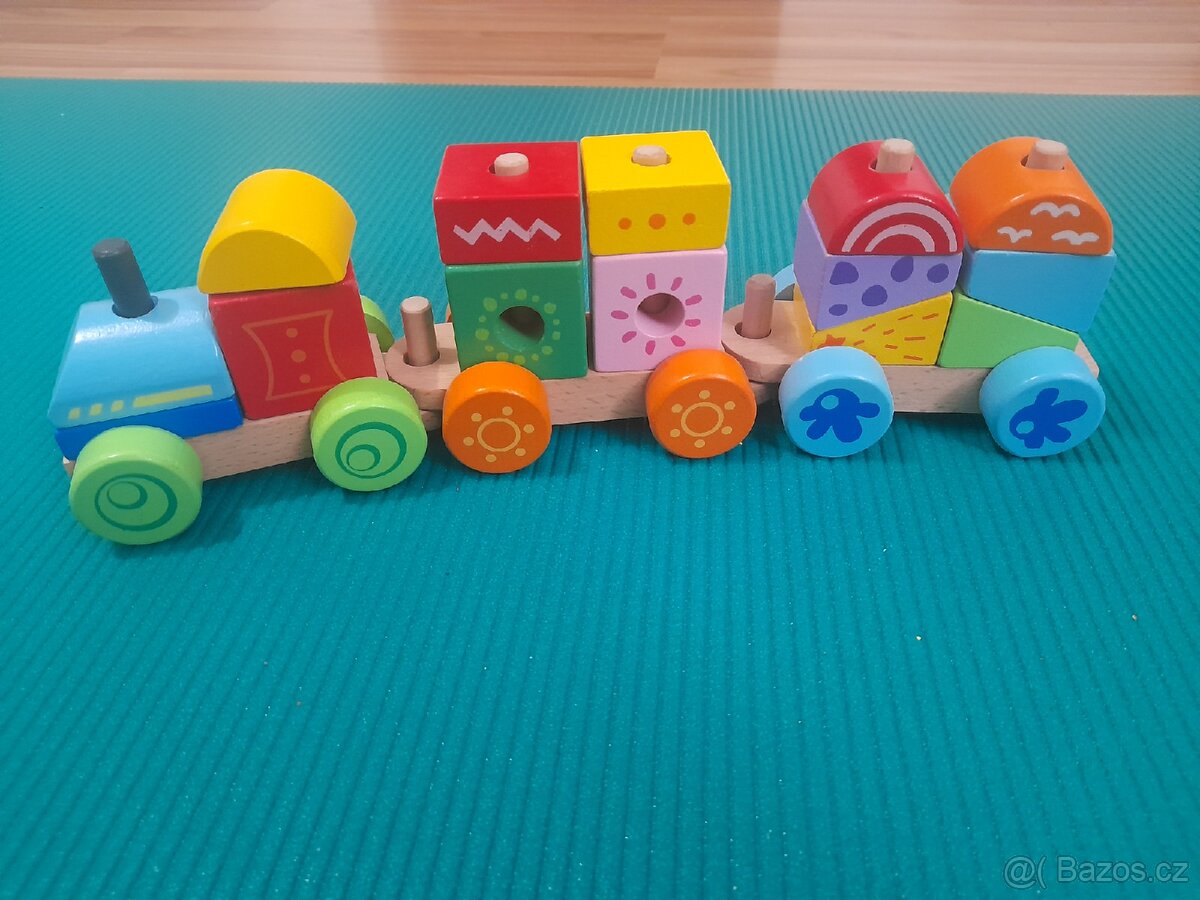 Dřevěný vláček s kostkami, které lze na sebe skládat různými způsoby. Kvalitní provedení, nepoškozený, jako nový.