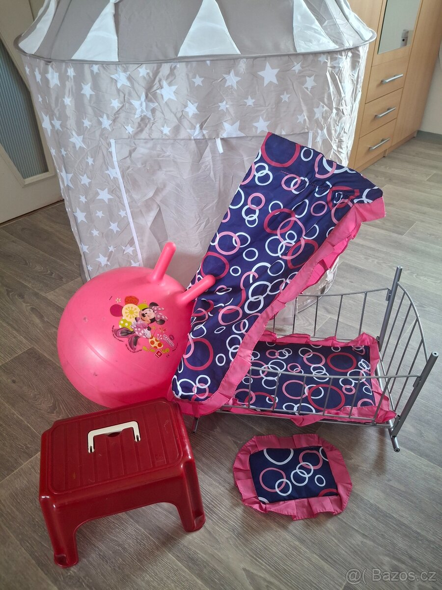 Prodám skákací balón Mickey Mouse, kolébku pro panenky a schodecek nebo židličku. Cena za vše dohromady.