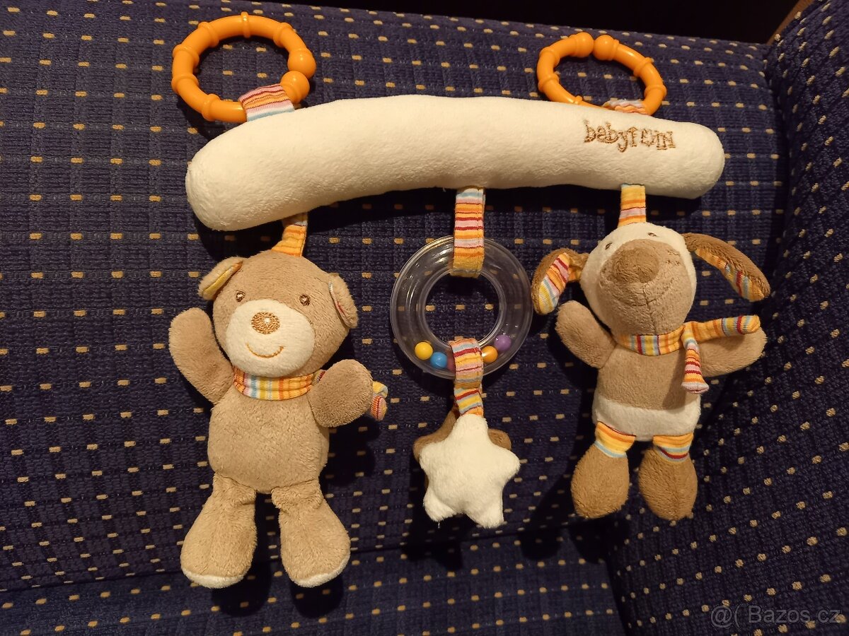 Chrastící medvídek, pískací pejsek a kuličkové chrastítko s kytičkami.