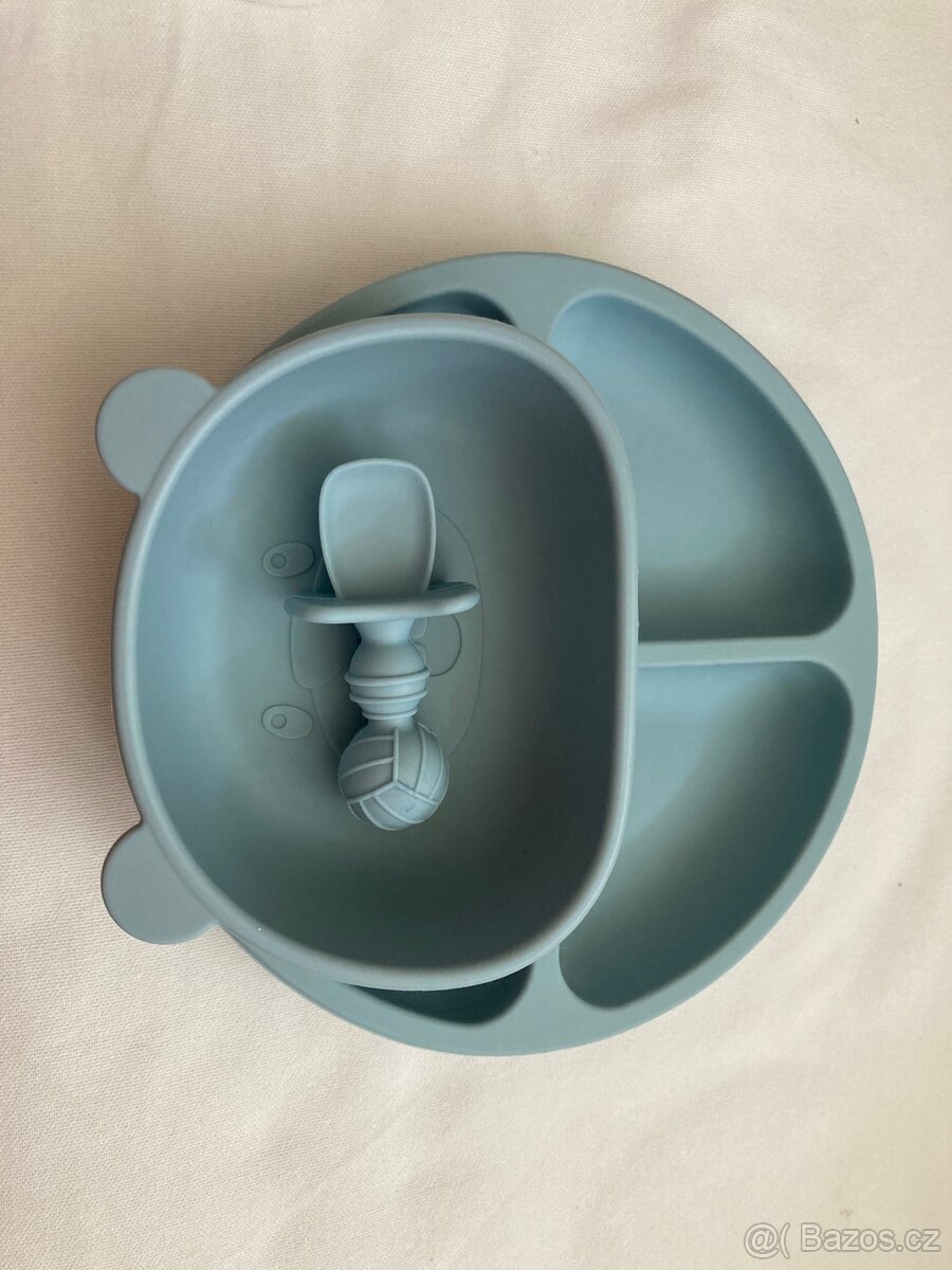 Silikonová, zdravotně nezávadná první jídelní sada pro deti od cca 6 měsíců. Lze mýt v myčce.