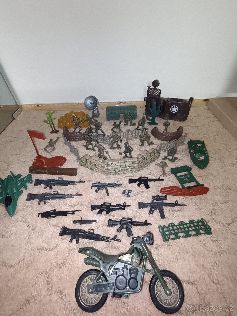 Prodám velkou sadu vojenských hraček – vojáčci, zbraně, motorka, letadlo, ploty, základna a další doplňky. Ideální na hraní i stavění bitevních scén. Vše viz foto.