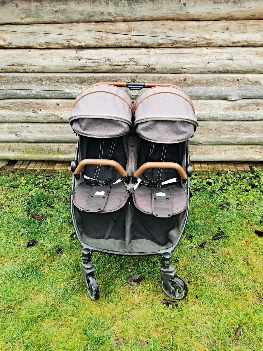 Vlastnosti: - jedno sedátko je vhodné pro dítě do 15 kg, celková nosnost kočárku je pak do 30 kg - sportovní dětský kočárek má šířku 75 cm - s přehledem projedete skoro všemi dveřmik - gelová kola velmi odolná proti propíchnutí - přední kola tlumí nárazy - dvojitá přední kola jsou otočná s možností jejich uzamčení - velmi jednoduchý systém skládání celého dětského kočárku - kočárek po dvojčata má malou velikost po složení - v boudičce je zabudované okénko, umožňující kontrolu dětí - sedátka mají na zadní straně větrání, které umožňuje cirkulaci vzduchu v teplých dnech - polohování zádíček až do lehu - polohování nožiček - madlo je vyrobené z kvalitní eko kůže, která dodává kočárku elegantní vzhled - každé sportovní sedátko má své vlastní madlo - 5-ti bodové bezpečnostní pásy - velmi prostorný nákupní košík s nosností 2 kg - hlavní centrální brzda - součástí sportovního dětského kočárku pro dvojčata jsou nánožníky pro každé sedátko - hmotnost: 13,5 kg