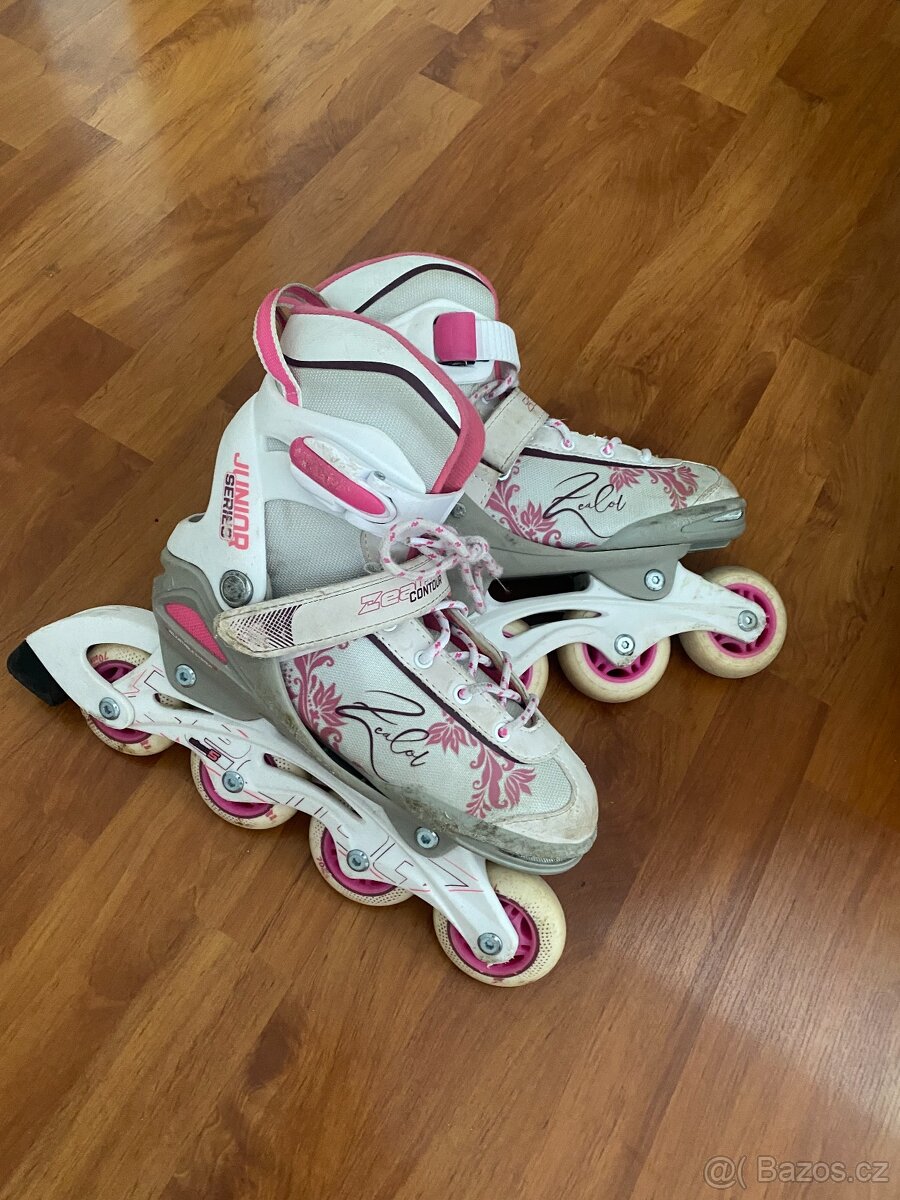 Prodám dívčí kolečkové brusle rostoucí vel. 33-36. Trochu odřené, ale plně funkční.