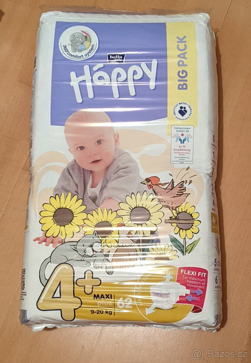Prodám neotevřené pleny Bella Happy vel. 4+, 9-20 kg, 62 ks v balení.