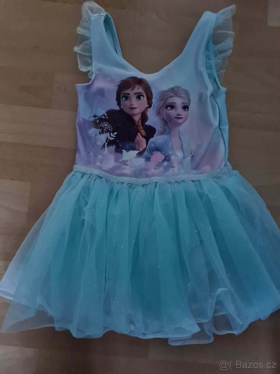 Detaily: Šaty mají vpředu velký potisk princezen Elsy a Anny. Sukně je tylová, ve více vrstvách a posypaná jemnými třpytkami. Pas je lemován stříbrnou třpytivou gumou. Ramínka jsou zdobená volánky z tylu. Jsou pohodlné a lehké.