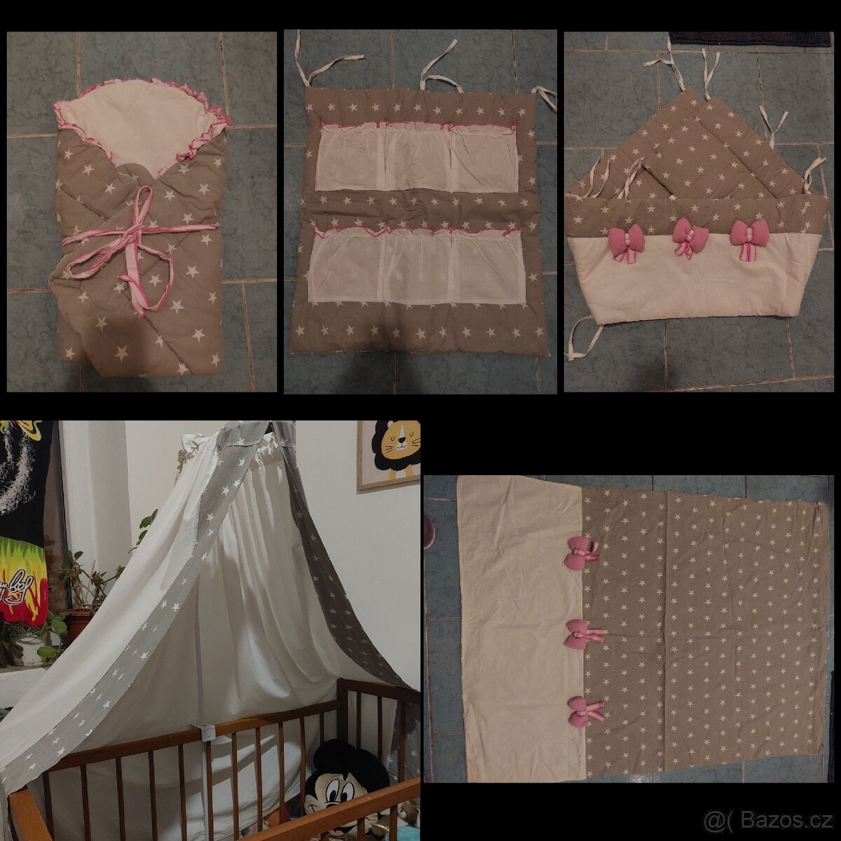 Prodám pěti dílný set do postýlky pro holčičku, šedý s hvězdičkami a mašličkami. Set obsahuje -