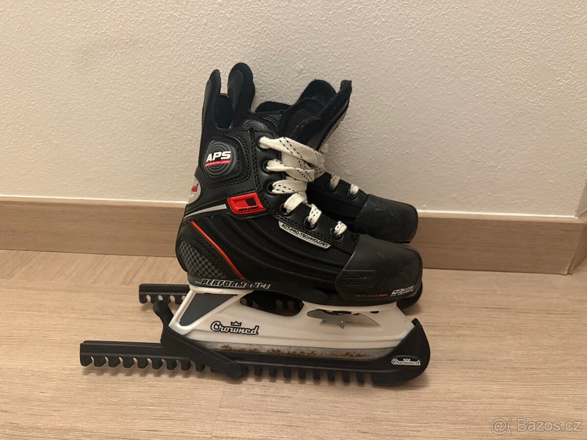 Chlapecké lední hokejové brusle Crowned s nastavitelnou velikostí botičky v rozsahu 4 velikostí. Původní cena 1399,-Kč + plastové chrániče nožů 200,-Kč.