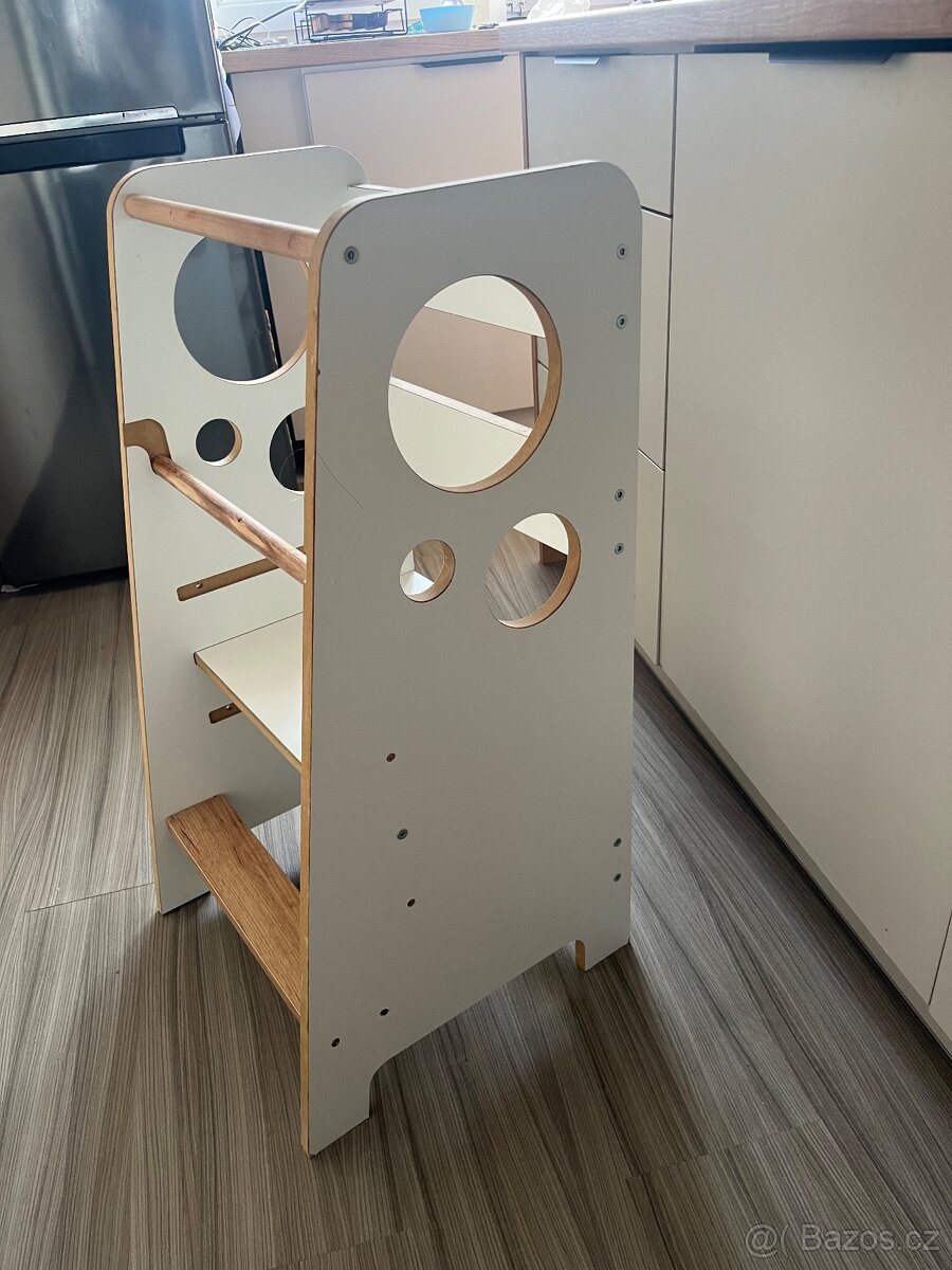 prodáváme rok starou učící věž, zakoupenou přes marketplace obchodního řetězce Kaufland. Učící věž má tři různé stupně výšky, nastavitelné podle výšky vašeho dítěte. Zadní odjímatelná tyč zabrání pádu. Pěkný design. Pouze jsme vyměnili spodní schod (dekor dřeva), jelikož původní praskl. Plně funkční.