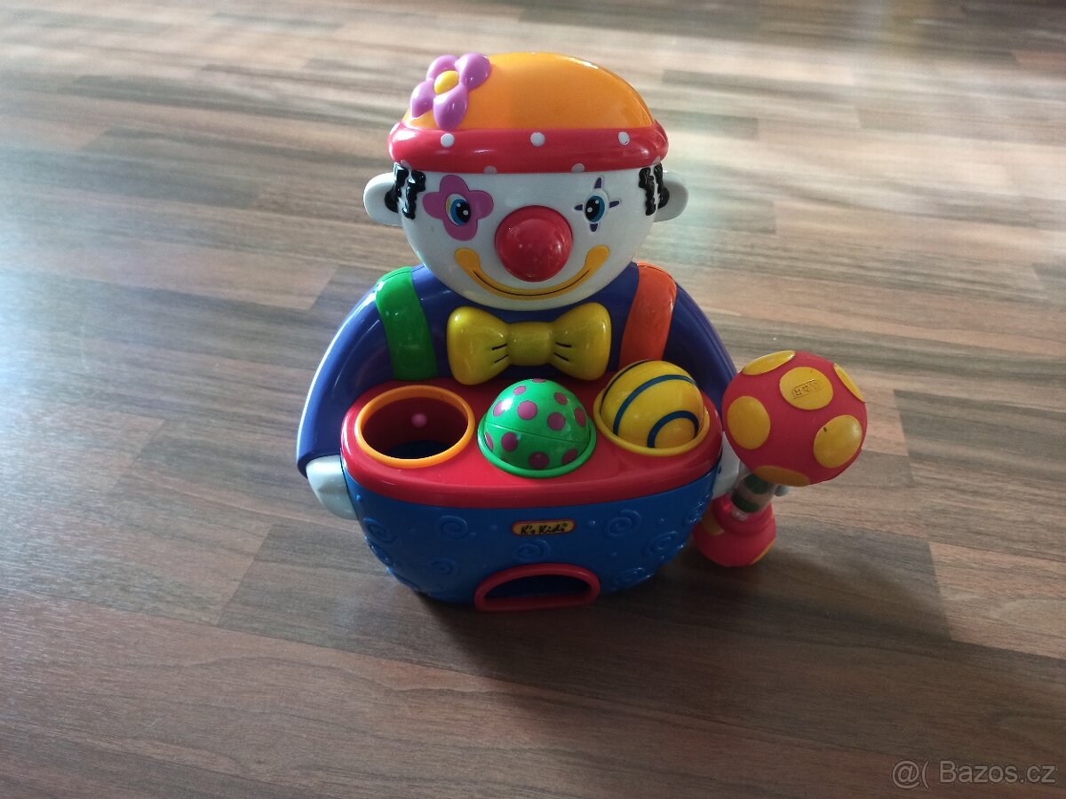 Zatloukačka klaun se zvuky - hrané , v pěkném stavu, na nose mírné oděrky. Jeden míček chybí, takže součástí prodeje jsou 2 plastové míčky a gumová palička. Při propadnutí míčku vydává zvuky a začne hrát melodií, při otočení nosem začne také hrát melodii. U nás hračka slavila úspěch, ani jsem to nečekala. Syn dostal v 17m a byl z klauna naprosto nadšený, moc se u hraní nasmál. Včetně originál krabice. Mohu zaslat video na ukázku.
