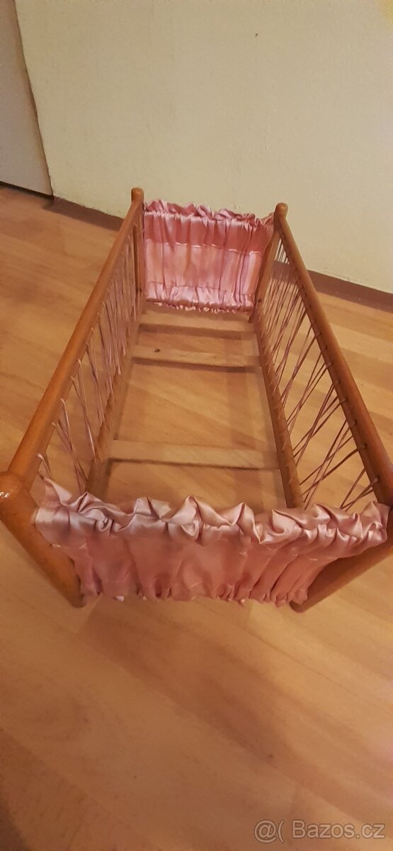 Prodám starožitnou retro postýlku pro panenky. Postýlka je v původní krabici dřevěná rozkládací s peřinkami