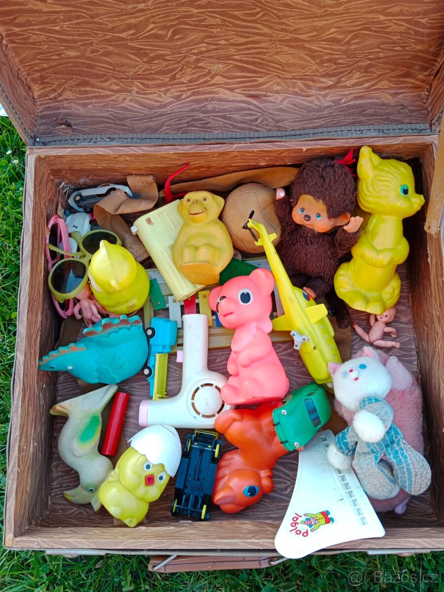 Retro hračky, piskaci zvířátka, moncici, moncicak, hra, autíčka, panenky, kufr, cena za celý kufr, tel. 605524904