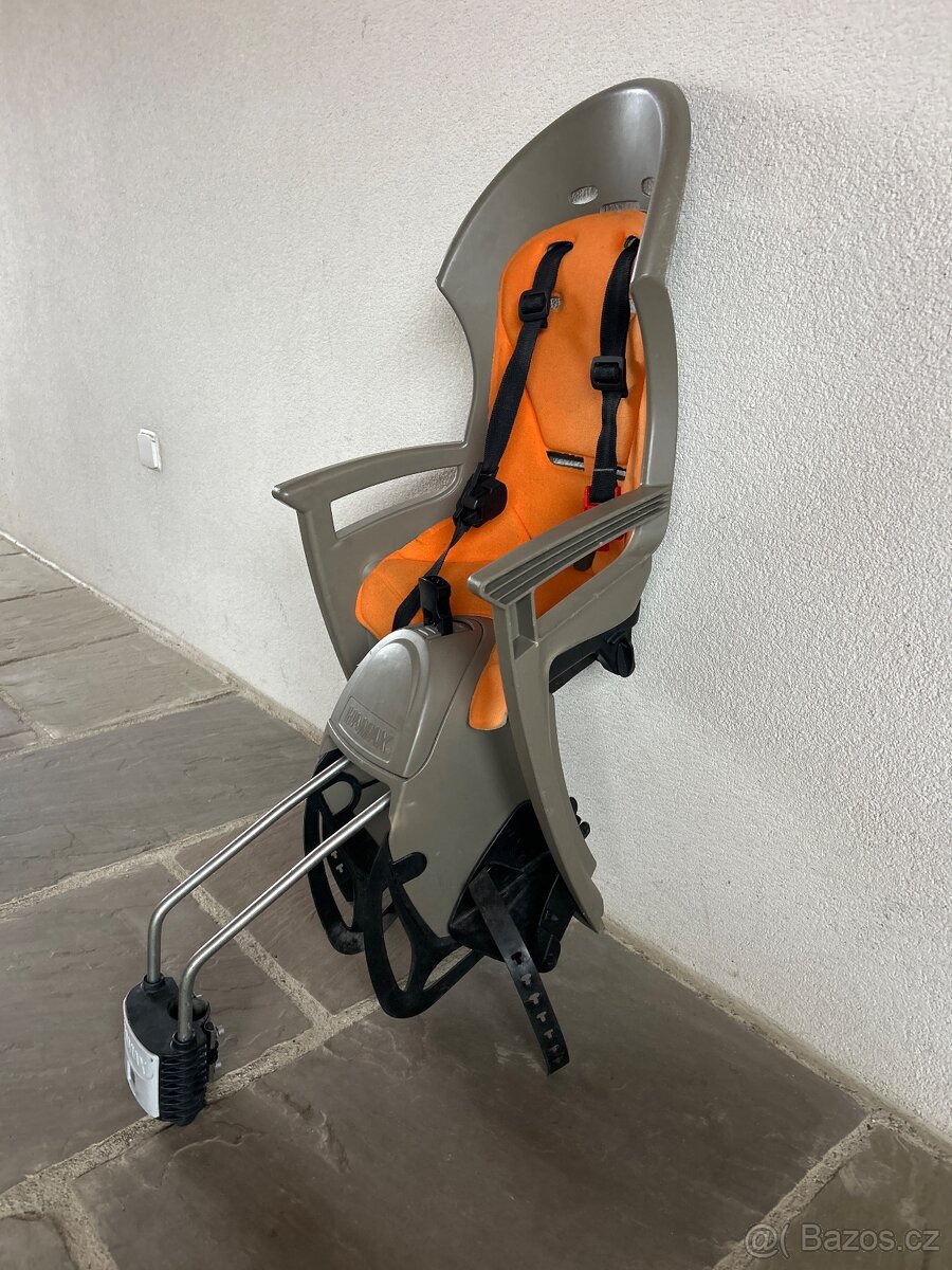 Dětská sedačka na kolo Hamax. Jednoduché uchycení na rám sedlovky. Vyškově stavitelné opěrky nohou + ochrana nohou před výpletem kola. Sedačka se dá posouvat dle velikosti dítěte.