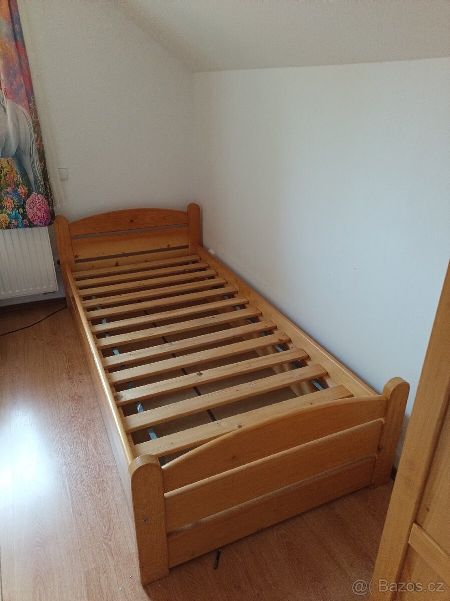 Pro rekonstrukci dětských pokojů nabízíme dětský nábytek z masivu. 2 postele pro matraci 90*200 s pevným roštem a s výsuvným úložným šuplíkem na kolečkách. Skříň výšky 150 cm. Se třemi šuplíky a 3 policemi vpravo, vlevo 2 týče na zavěšení oblečení. Závěsné police a jedna rohová. Nutný vlastní odvoz. Osobní převzetí.