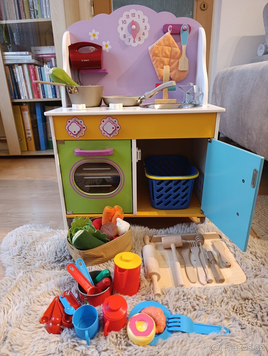 Kuchyňka je v moc pěkném stavu, drobné oděrky na úchytech a hraně poličky (viz. foto). Prodávám včetně příslušenství - vybavení kuchyňky - pánvička, rendlík, mixér na baterky "Bosch", dřevěné prkýnko, váleček, palička a další, nákupní košík, bavlněná zelenina v košíku, vykrajovátka (atd). Včetně zástěrky IKEA pro malé kuchtíky.
