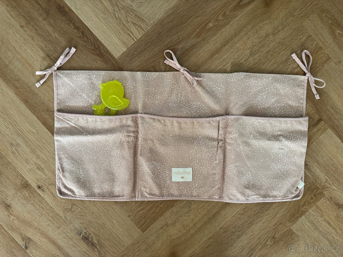 Hezký bavlněný kapsář na postýlku pro miminko. Španělská značka Nobodinoz. Rozměr cca 30 x 60 cm. Na plínky, hračky atd. V pořádku. Jedno poutko znovu přišívané. PC: 760,-