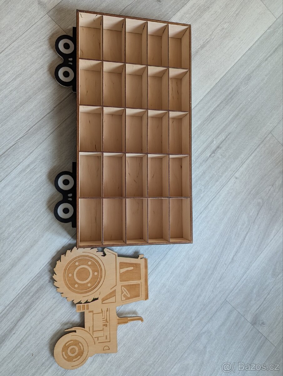 Prodám dřevěnou poličku traktor na autíčka angličáky, rozměry: výška 31cm a délka 80cm.