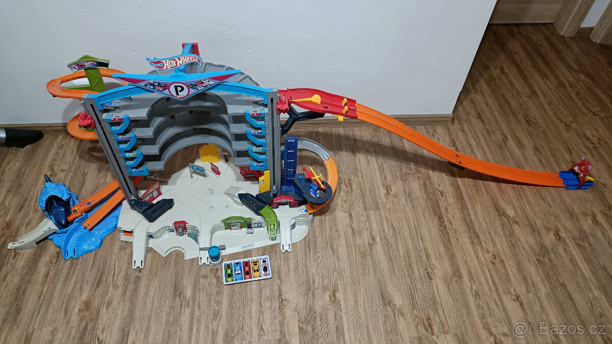 Prodáme hot wheels garaz, tak jak je na fotce.Vse 100% funkční, nezohybane apod.,plus pet autíček.