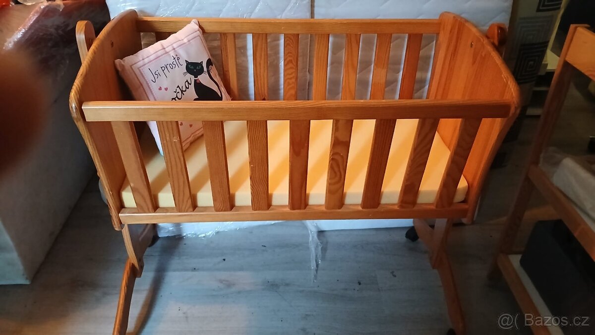 Dřevěná kolebka, včetne matrace, povlaku na ni, mantinelu, nebes a stojanu na nebesa. Ještě dofotim. To je vyprané a vyžehlené, připravené k odvozu.