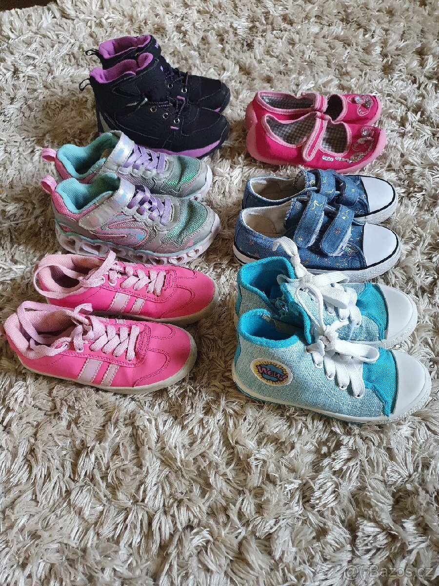 Prodám 5 párů dětských bot a jedny bačkůrky, vše velikost 29, bačkůrky 30. Modré plátěné kotníčkové tenisky na zip jednou na noze, modré plátěnky na suchý zip, skechers na suchý zip, teplejší černo-fialové kotníčkové boty na suchý zip, bačkůrky na suchý zip, růžové tenisky na tkaničky. Cena uvedena za všechny
