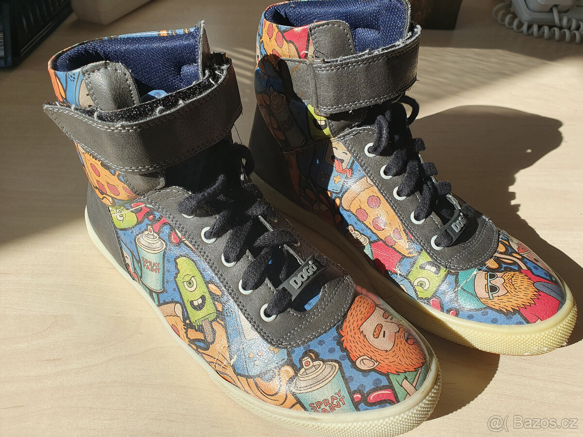 Prodám dívčí kotníčkové boty DOGO vel 36 s obrázky – tkaničky a dva suché zipy s kovovým očkem. Nošené jednu sezonu – stav viz foto, suché zipy pevně drží. Vnitřní vložka přeměřena na 23,7 cm.