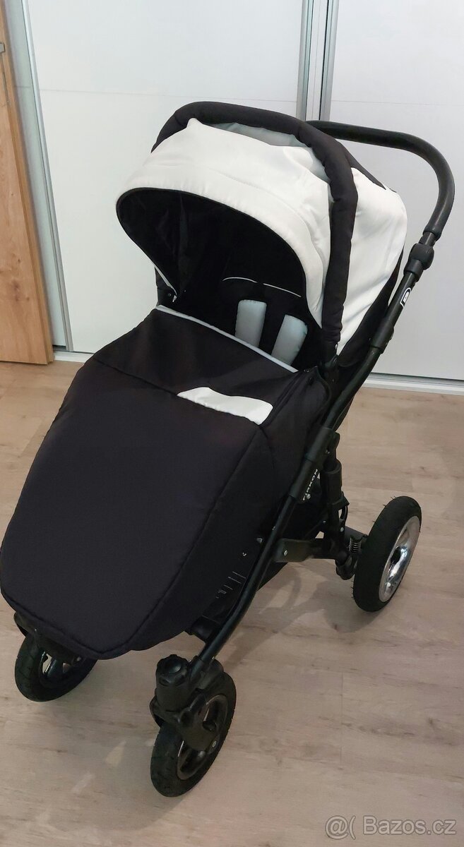 Součástí tak je: podvozek s nafukovacimi kolečky- se dvěma pevnými a dvěma otočnými kolečky, která umožňují areataci; korbičku na ležící miminko a sportovní polohovatelnou nástavbu pro větší miminko s kšírkami, která se nechá nasadit po i proti směru