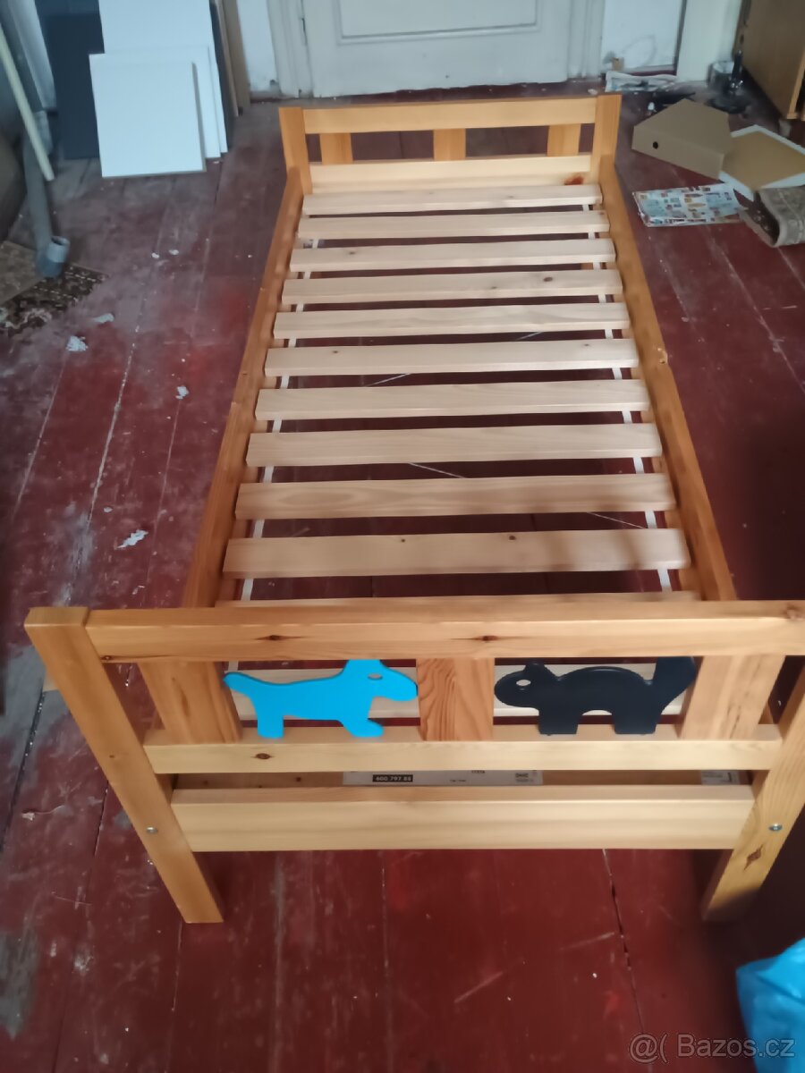 Dřevěná dětská postýlka. Rozměry: délka 166cm, šířka 77cm, výška čela u hlavy 40cm a výška čela u nohou 20 cm. Lze rozebrat. Bez matrace.