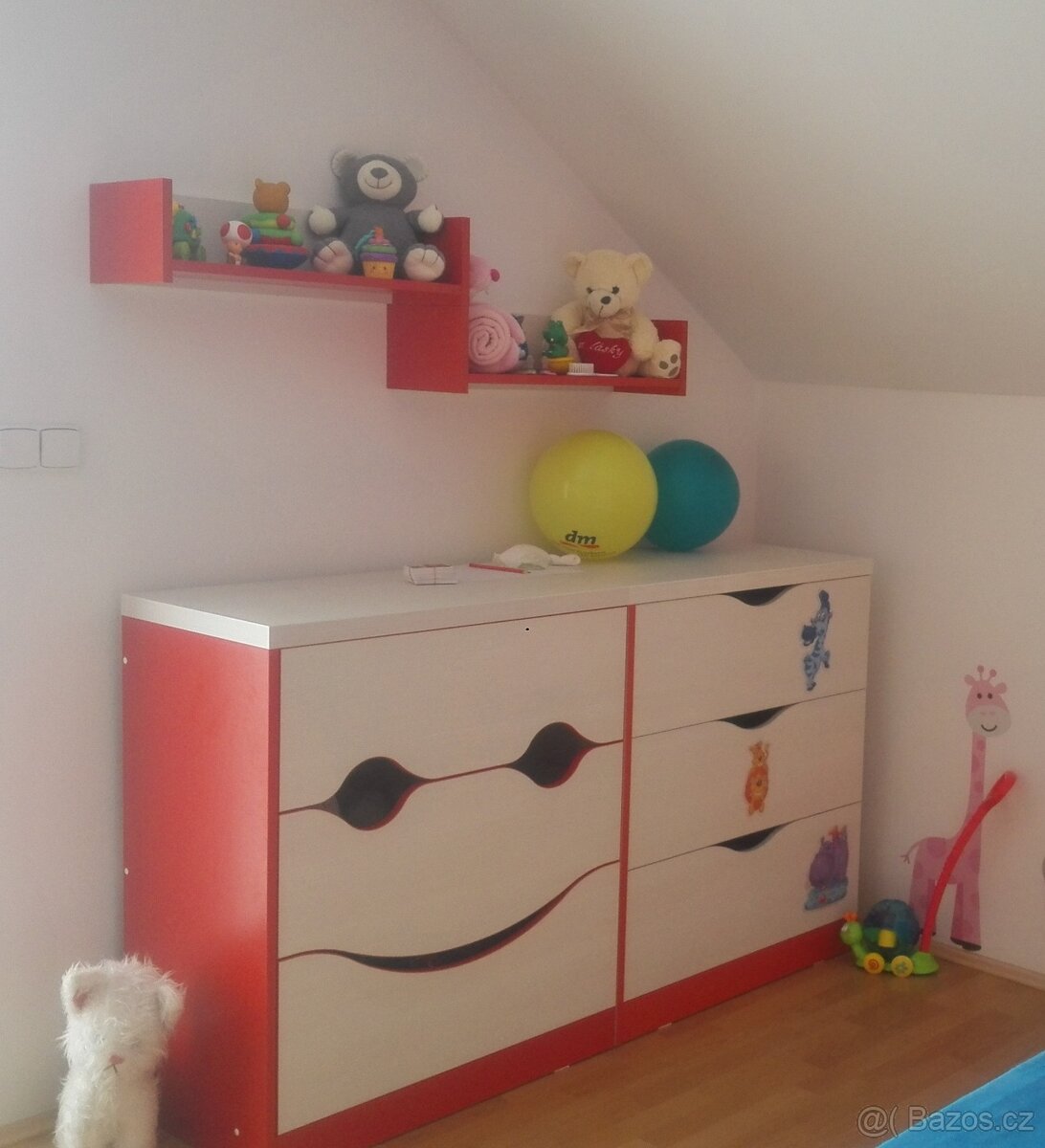 Dvě komody s přebalovacím pultem, pult se vymění za vrchní desku komody, dá se umístit na obě. Komody jsou bytelné, byli svrtány k sobě dírky jsou opravené, zohledněno v ceně. Plus dvě police.