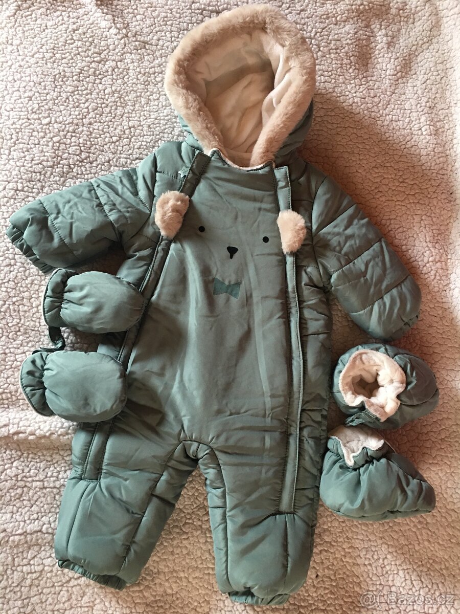 Krasny teply overal zelene az olivove barvy pro miminko 2-4m nebo 65cm s kapuci a odepinacimi rukavicemi a navleky na nohy. Po jednom diteti, minimalne pouzity, jako novy.