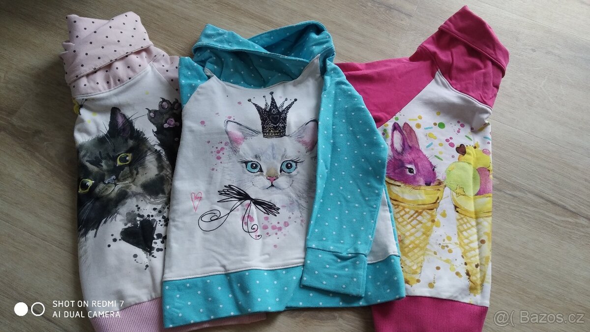 Nádherná mikina pro holčičku, česká Hand Made výroba, krásný stav, cena za kus 349,- Kč. Modrá velikost 104-110, růžové 110-116, ale všechny vydrží déle. Ušity na zakázku, dcera je milovala.